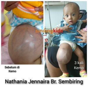 Nathania Jennaira Boru sembiring adalah salah satu pejuang cilik yang saat ini berusia 7 bulan. di diagnosa Fibro sarcoma dan harus menjalani kemoteraphy. usianya masih sangat bayi namun jennaira tetap kuat selama menjalani kemoteraphy. di dampingi oleh kedua orang tuaya , puji Syukur sejauh ini jennaira sudah menjalani 3 kali tahap kemo. dan kabar baiknya adalah kemonya sangat sangat respon sehingga benjolan besar di paha kanannya berangsur mengecil.