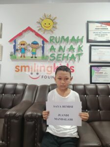 Juandi merupakan anak dampingan smiling kids foundation yg resmi bergabung sejak agustus 2024. Juandi tinggal di rumah singgah smiling kids foundation selama pengobatan.